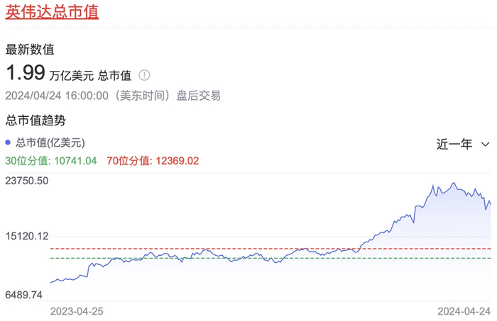 目前英伟达市值徘徊在2万亿美元左右,估值短短9个月从1万亿美元增加到超过2万亿美元,跻身全球市值前三。