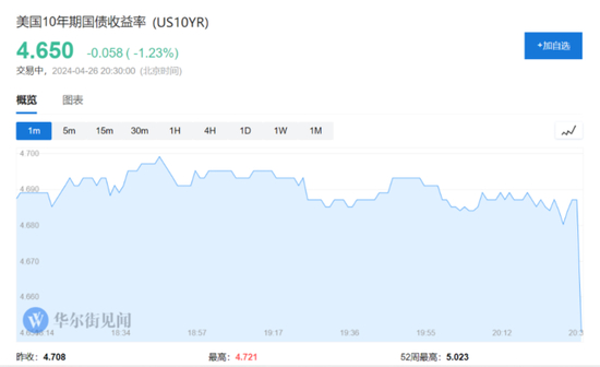 美国10年期国债收益率短线下行约3bp,报4.650%。