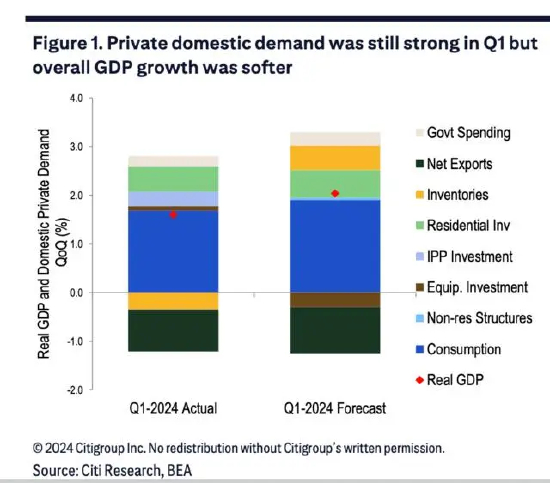 这是因为,增长放缓的担忧将是美联储考虑降息的关键因素,而第一季度GDP的细节显示财政刺激的支持在减弱,商品支出也较软。因此花旗认为,尽管通胀尚未持续放缓,美联储仍将在今年夏天降息。