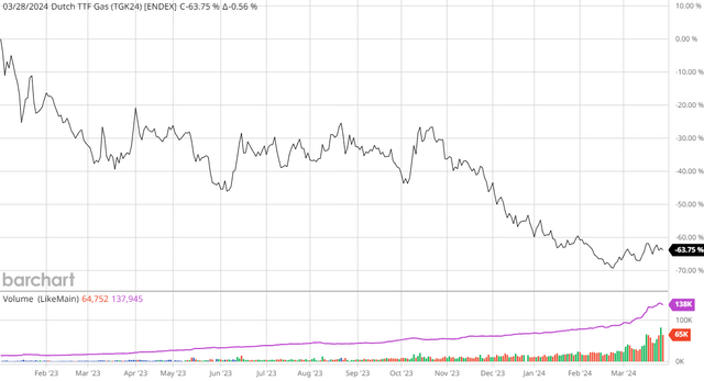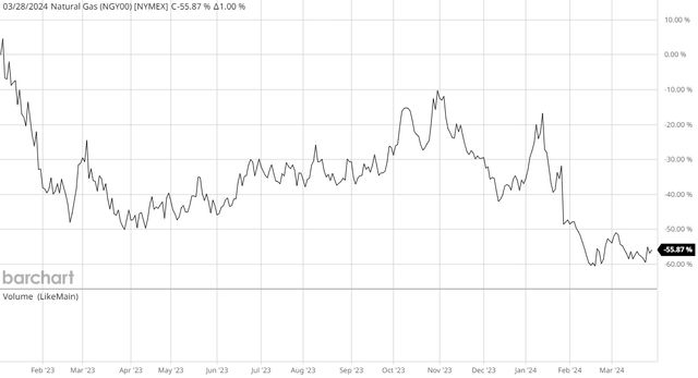 然而,天然气的情况则不同。2023年冬季,北半球大部分地区异常温暖的天气导致天然气消耗量低于正常水平。此外,自由港液化天然气停运暂时减少了市场每天20亿立方英尺的天然气需求。这自然导致国内天然气市场供应过剩,尽管Freeport LNG恢复正常运营,但情况依然如此。这导致亨利港天然气现货价格从2023年1月到2024年3月下跌了55.87%: