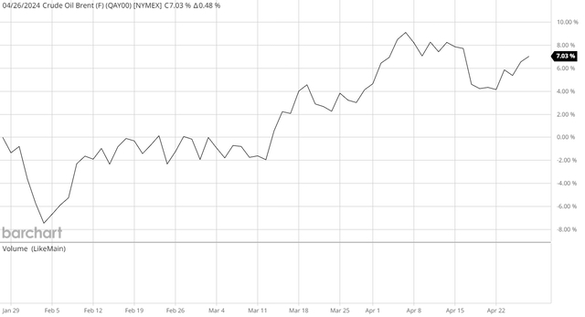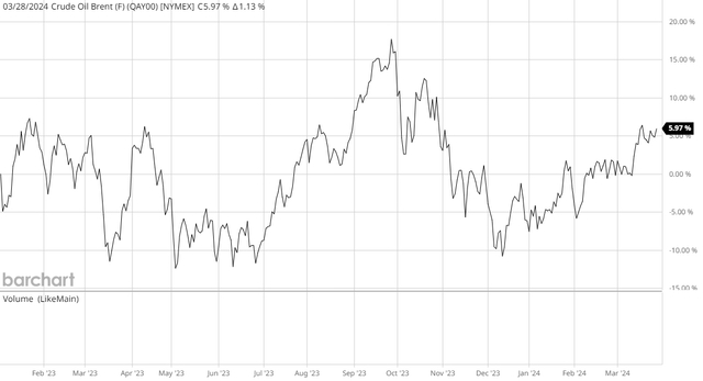乍一看,这些结果似乎非常令人失望。毕竟,与去年同期相比,埃克森美孚的所有重大经营业绩指标均有所下降。造成这种情况的最大原因之一是2024年第一季度的原油和天然气价格低于2023年第一季度。考虑到汽油价格上涨已多次成为头条新闻,这似乎令人惊讶最近。然而,此图表显示了2023年1月1日至2024年3月31日期间布伦特原油的现货价格: