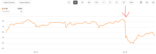 2024年4月26日星期五,石油和天然气巨头埃克森美孚公司(NYSE:XOM)公布了2024年第一季度盈利结果。乍一看,这些结果有些好坏参半。该公司的收入确实超出了分析师的预期,但不幸的是,它未能达到分析师的盈利预期。就其本身而言,市场对这些结果根本没有留下深刻的印象,导致埃克森美孚在这些结果发布后的盘前交易时段暴跌: