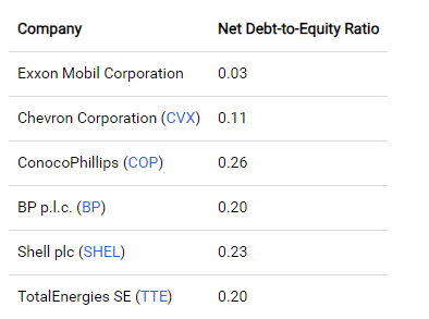 截至2024年3月31日,埃克森美孚的净债务为71.2亿美元,而股东权益为2,130.52亿美元。这使得该公司目前的净债务股本比率为0.03。对于任何美国公司来说,这显然是一个令人难以置信的低比率,但与该公司的一些同行相比,情况如下: