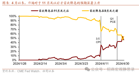 • 我们维持大选前难以降息的判断。一方面,当前美国属于非典型滞涨,经济仍有韧性,通胀是首要任务。美国一季度GDP季调环比折年率初值1.6%,大幅低于预期和前值,若改为同比口径,Q1实际GDP同比为2.97%,虽低于前值3.13%,但为2022年Q2以来次高。鲍威尔发言中也指出,私人国内最终购买(不包括库存投资、政府支出和净出口)Q1增长3.1%,仍然强劲。本周公布的美国4月ADP就业大超预期、美国Q1劳工就业成本指数增速超预期,也都指向通胀是当前首要任务。