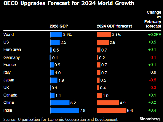 经合组织将2024年全球增长预测从2月的 2.9%上调至3.1%,对美国、中国和印度的预期明显改善。明年的增长预计将继续保持在 3.2%。