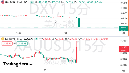 美元指数闻讯短线走低超50点。现货黄金短线上扬逾20美元,一度触及2320关口。现货白银短线拉升约0.5美元。大多数期限的美债收益率日内跌幅至少达到10个基点。美股股指期货攀升,标普500指数期货上涨1.2%,纳斯达克100期货涨1.5%,道指期货涨0.97%。