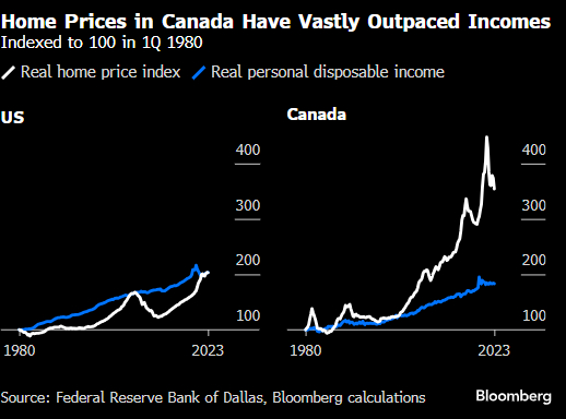 虽然数百万美国人也面临住房负担能力危机,但在过去20年的大部分时间里,他们的实际可支配收入增长一直高于房价的上涨。但在加拿大却不是这样。多伦多的房价中位数现在是130万加元,几乎是美国如芝加哥这样的同类城市的三倍。