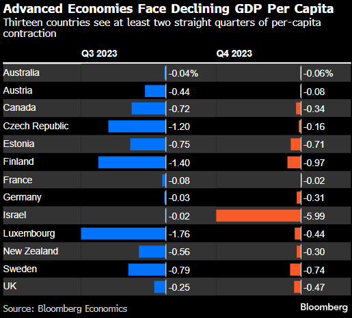 在欧洲,德国最大的经济体也出现了人均经济衰退,其背景是大量寻求庇护者、住房短缺和经济低迷导致的政治紧张局势加剧。分析显示,法国、奥地利和瑞典也在人均经济衰退之列。