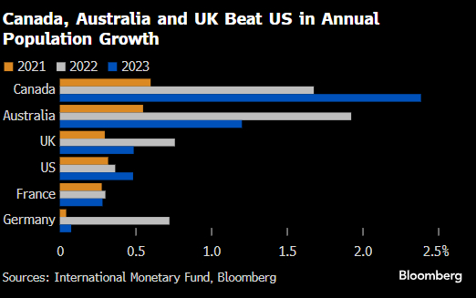 虽然美国出现了广泛覆盖的合法和非法移民激增,但与加拿大的增长率相比,增长的规模实际上相形见绌。去年,这个北方国家每1000名居民中就迎来32位移民,而美国只有不到10人。
