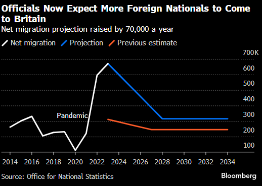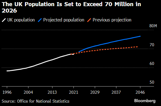 在同一时期,人口激增,估计增长了11%,即近700万,达到6900万。国家统计局(Office for National Statistics)预计,在最新的人口预测中,到2036年,这个数字将达到近7400万,目前预计增长将更快。它在1月份表示,2021年至2036年期间预计超过90%的人口增长将来自移民。