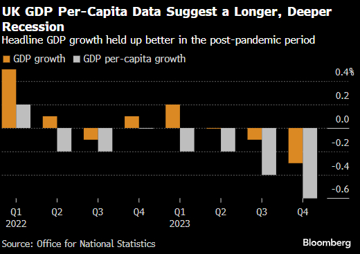 自2020年疫情引发的短暂衰退以来,GDP每个季度都在增长,但按人均计算,GDP在2023年最后三个月连续第三个季度收缩,这是自20世纪90年代初经济衰退以来最严重的下降。