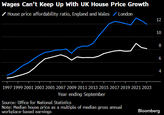 人口更多的人缺乏房产,导致英格兰和威尔士的房价达到平均收入的8倍以上,伦敦为12倍。1997年时,分别为3.5倍和4倍。供应不足也导致租金在过去12个月里以创纪录的速度飙升,加剧了英国年轻人的生活成本危机。