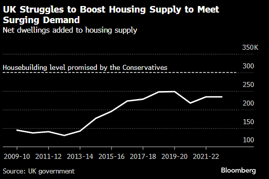 官方数据显示,2022-23年,英国住房供应增加了23.44万套住房,远低于满足巨大需求所需的水平,也低于保守党在上一次选举中承诺的到2020年代中期实现每年30万套住房的目标。