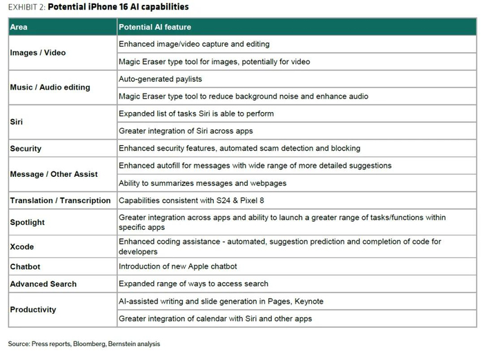 华尔街老将Bernstein在研究报告中预测,苹果大多数的AI功能可能会在今年9月的iPhone新品发布会上发布。不过,一些AI功能细节在6月的全球开发者大会(WWDC)上提前公开。