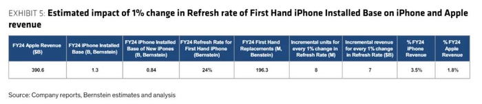 根据Bernstein测算,换机率每提高1%,将带来1.8%的增量收入(见下图)。