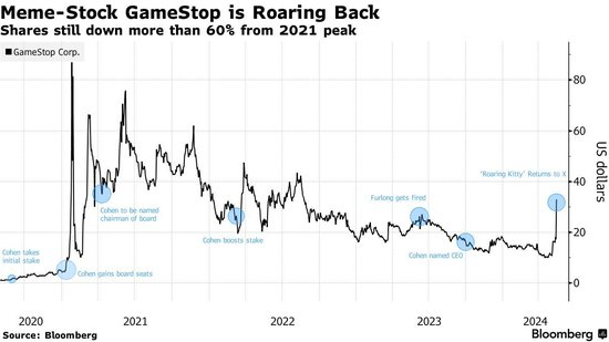 值得注意的是,根据金融分析公司S3 Partners的数据,该股可供交易的卖空股票比例一直保持在24%左右。这对于一家普通公司来说已经很高了,但还远未达到2021年狂热之前的水平(当时约140%的可用股票被卖空)。在三年前的第一轮飙升中,GameStop在几天内飙升了超过1000%,因为散户交易员们在Reddit公司的WallStreetBets论坛上与做空该股票的华尔街大佬们展开了对垒。“Reddit Raiders”曾经因为疫情时期的刺激政策和工作政策而拥有充裕的时间和现金,但现在大部分人都回到了工作岗位,承受着更高利率的负担。有些人很晚才参与到当时的狂热之中,即使最近股价有所飙升,他们仍在蒙受损失。专业做空者也基本放弃了对股票流通量相对较小的公司的攻击,因为他们担心社交媒体的力量会煽动挤压。