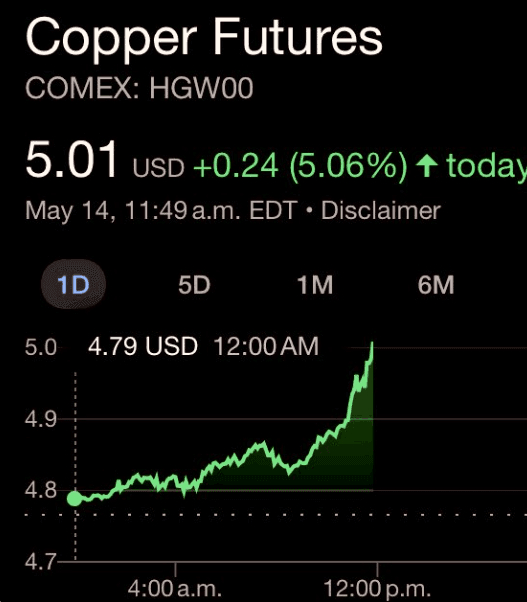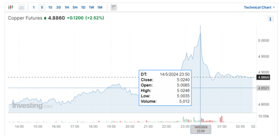 北京时间周二晚23:50分,美国交易时段,纽铜出现逼空行情,纽约铜期货盘中飙升5.5%,Comex 7月交割的铜价跃升至日内高点,达到5.026美元/磅,距离2022年3月俄乌冲突早期时创下的历史高点5.0395美元仅一步之遥。