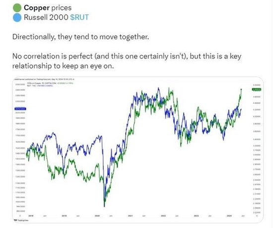 还有网友注意到了铜价和美股小盘股的基准股指罗素2000之间的高度相关性: