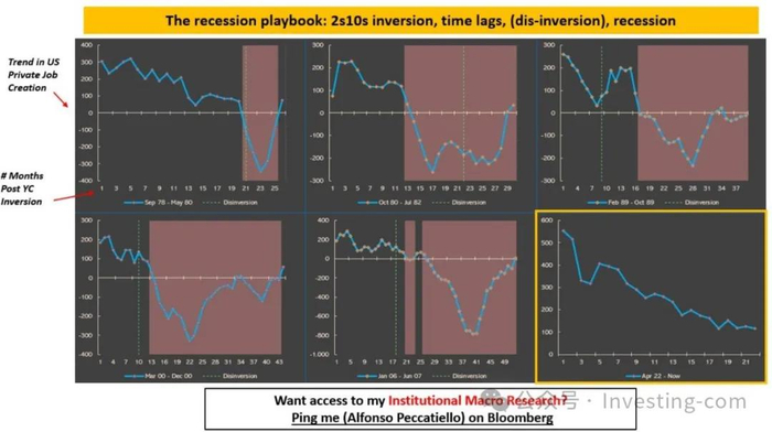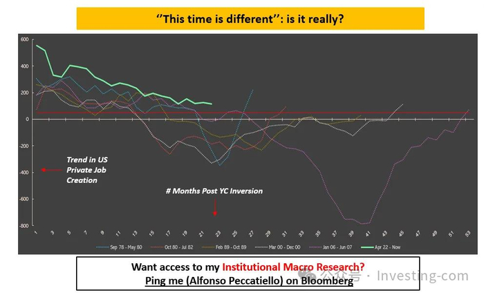 下面的图表展示了在收益率曲线持续倒挂后的几个月里,美国私人部门就业创造的趋势(蓝色线条)。