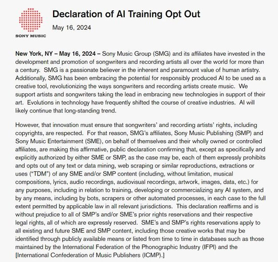 索尼音乐也在官网上发布了一份题为《选择退出AI训练的声明》,公开喊话要求侵权的全球开发者立即停止使用侵权信息训练AI,并保留对过往侵权行为的追溯权。当然,被索尼亲自寄警告信的公司,摊上的事也会更大一些。
