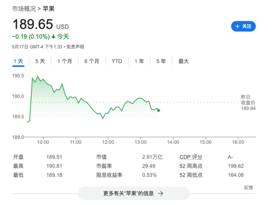 苹果股价周五美股盘中下跌0.1%,报189.65美元。