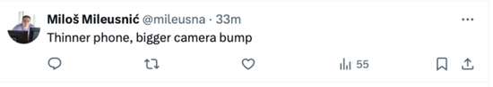 分析认为,更薄的新iPhone可能会重新激发消费者对该产品的兴趣,给消费者提供升级设备的理由。自2020年iPhone 12发布以来,苹果因每年只对iPhone的设计进行微小改动而受到批评。例如,2022年,苹果已故联合创始人史蒂夫·乔布斯的女儿伊芙·乔布斯在Instagram上调侃iPhone 14的设计与iPhone 13几乎相同,引起了媒体的关注。