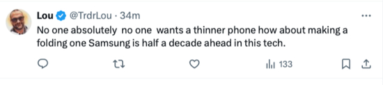 还有网友说,没人想要更薄的iPhone,折叠屏多香,三星在折叠屏技术上已经领先苹果五年了。