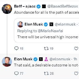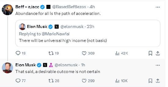 另一位用户在马斯克的帖子下评论称:“所有人的富足是加速之路。”