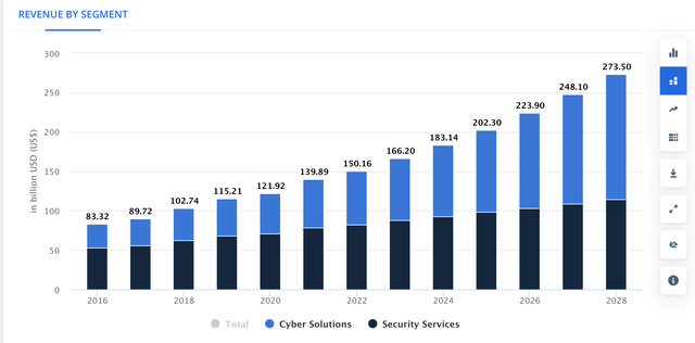 全球网络安全市场的收入预计在2028年全年将以10.48%的速度增长,从2023年的1652亿增长到2028年的$2735亿。