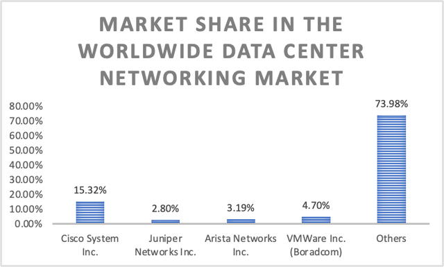 思科是数据中心领域领先的网络公司,但它并未占据大部分市场份额,因为它仅控制着约15.32%的市场份额。然而。其他竞争对手包括Juniper Networks、Arista Networks和Broadcom。这些公司分别控制着2.80%、3.19%和4.70%的市场份额。
