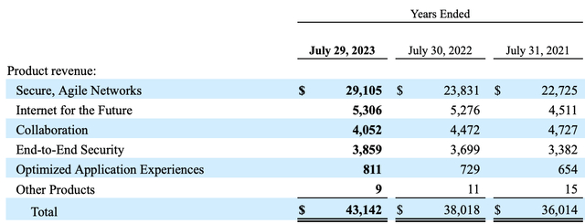 在其2023财年10-K中,我们可以观察到网络领域每年增长14.09%,同时,物联网增长8.8%,端到端安全增长7.57%,优化应用体验增长12%。唯一出现负增长的细分市场是合作,为-7.44%。