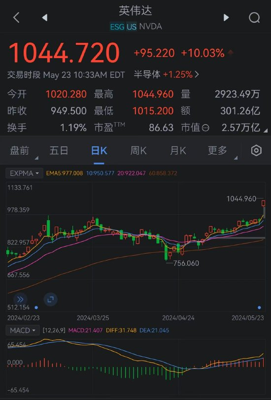 而截至发稿,英伟达涨10%,报1044.72美元,总市值达2.57万亿美元,