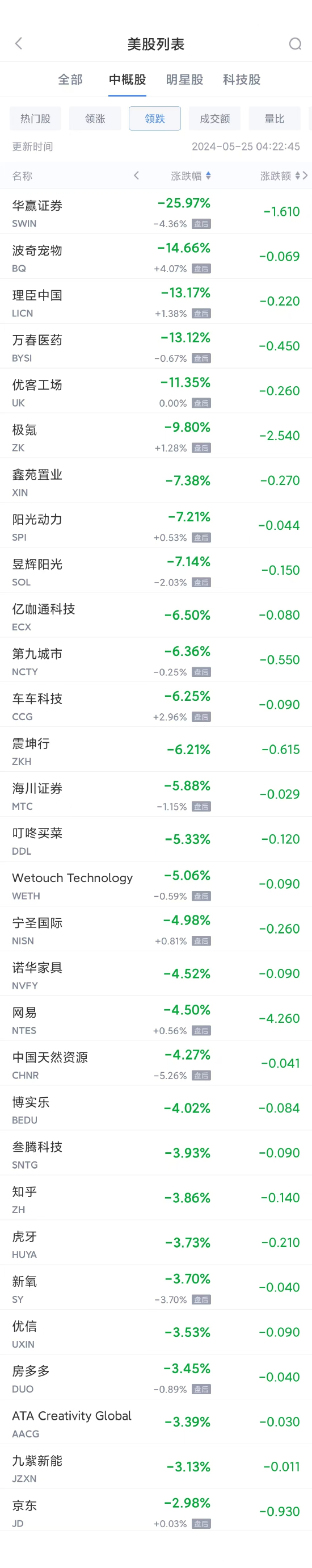 下跌股当中(按市值降序排列),网易跌4.50%,京东跌2.98%,百度跌1.13%,贝壳跌2.00%,中通跌1.80%,百济神州跌2.22%,新东方跌1.34%,BOSS直聘跌1.07%,极氪跌9.53%,360数科跌0.25%,雾芯科技跌1.04%。