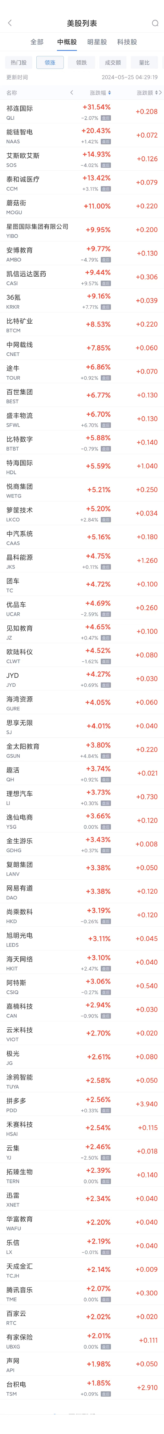 上涨股当中(按市值降序排列),台积电涨1.85%,拼多多涨2.56%,阿里巴巴涨0.58%,携程涨1.52%,中华电信涨0.20%,腾讯音乐涨2.10%,日月光半导体涨1.46%,理想汽车涨3.73%,华住酒店集团涨1.12%,富途控股涨1.14%,蔚来涨0.52%,满帮涨0.21%,唯品会涨0.13%,小鹏汽车涨1.17%,名创优品涨0.72%,哔哩哔哩涨1.46%,WSP控股涨1.41%,爱奇艺涨0.21%,汽车之家涨0.44%,慧荣科技涨0.67%,陆金所控股涨0.47%,亚朵集团涨0.46%。