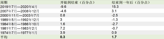 通常情况下,当经济出现放缓或衰退时,美联储会通过降息来应对。因此,美联储的数据显示,之前的七次降息周期(如下表所示)都发生在美国经济衰退期间或前后。