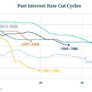 然而,通胀奋起直追,在上一次降息周期一年后上升了1.9个百分点。随着利率下降,消费者受到刺激,增加支出,减少储蓄,这导致商品和服务价格在过去七个周期中的六个周期中出现上涨。