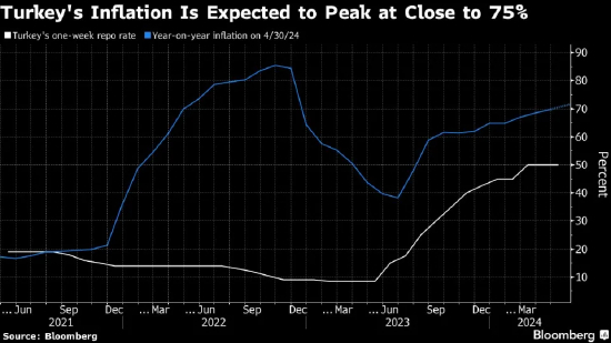 长期的年度价格上涨是超宽松货币政策、财政慷慨和里拉长期不稳定的遗留问题。调查的经济学家估计中值显示,在可能出现转机之前,5月份的通胀率接近75%,而一个月前的通胀率略低于70%。