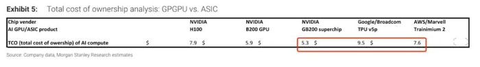 需要注意的是,ASIC的成本也许高于通用算力卡。根据大摩的测算,GB200的TCO(总拥有成本),比TPUv5低了44%,比Trainimium 2低了30%。