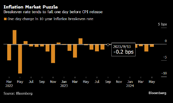 历史数据显示,美国CPI发布前一天10年期通胀保值国债(TIPS)的表现总是弱于普通美国国债,几乎每个月都是如此。自从2022年3月美联储开始加息以来,在CPI发布前的一个交易日,10年期盈亏平衡通胀率(即通胀保值国债与美国国债收益率之差)27次里有22次下跌。