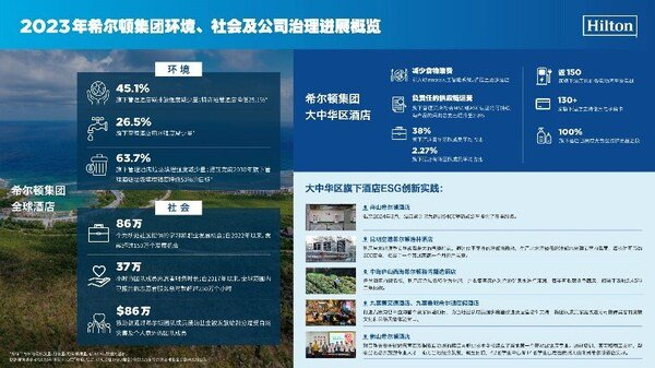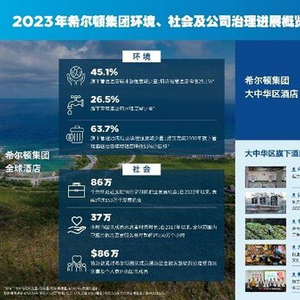 根据报告,以2008年为基准,2023年希尔顿集团旗下管理酒店及特许经营酒店碳排放强度分别降低45.1%和25.1%;集团旗下管理酒店用水强度降低26.5%;集团旗下管理酒店垃圾填埋强度降低63.7%,提前完成2030年旗下管理酒店垃圾填埋强度降低50%的目标;为团队成员及所在社区提供了超过86万个学习和职业发展机会;在全球社区范围内完成了超过37万小时的志愿者服务;通过希尔顿团队成员援助基金,向部分遭受自然灾害及个人意外的希尔顿集团团队成员发放了超过86万美元的救助。