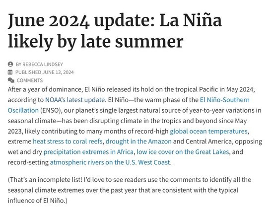 根据NOAA的说法,目前太平洋进入了所谓的厄尔尼诺/南方涛动现象(ENSO)中性阶段,也就是既没有厄尔尼诺,也没有拉尼娜现象。不过根据过去一个月海洋温度下降的情况,拉尼娜现象将会在今年7至9月期间不断发展,并持续影响整个北半球的冬季。