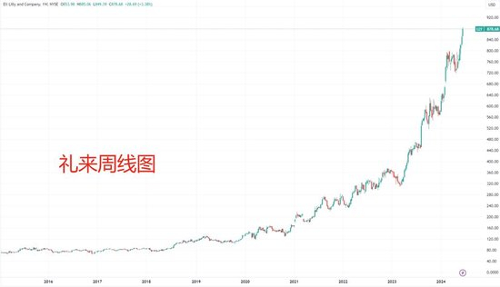 (自那通电话后,礼来公司的市值翻了10倍,来源:TradingView)