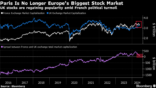法国股票总市值现在约为3.13万亿美元,略低于英国的3.18万亿美元。CAC 40指数抹去了2024年以来的所有涨幅,急剧逆转了一个月前创下纪录高位的局面。