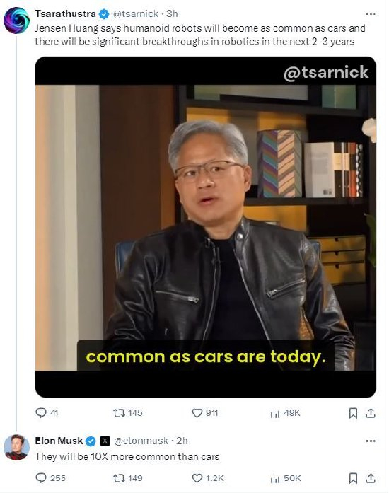 一位X用户分享了黄仁勋采访的视频片段。特斯拉CEO埃隆·马斯克回应称:“它们的普及程度将是汽车的10倍。”