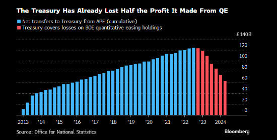 由于在全球金融危机和疫情期间的购买操作,英国央行最高峰时期持有的债券总额达到8950亿英镑。量化宽松为财政部带来了1240亿英镑的利润。然而,财政部已经花掉了这笔钱,现在随着英国央行削减持有量,损失也不断累积。