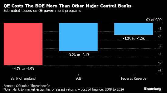 根据一项新的研究,英国央行因量化宽松(QE)计划所蒙受的损失达到美联储的三倍以上。该分析可能再次令英国央行十余年刺激行动的代价成为辩论热点。