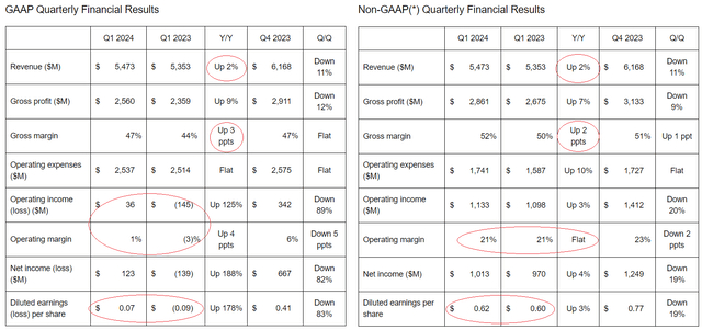 第一季度,AMD报告的营收为55亿美元(同比增长2%),毛利率为47%,同比增长300个基点。尽管根据GAAP报告标准,息税前利润仅为3600万美元,净收入为1.23亿美元(或每股0.07美元),但非GAAP数据更令人印象深刻,营业收入为11亿美元(同比增长3%),净收入为10亿美元(同比增长4%),摊薄每股收益为0.62美元(同比增长3%)。