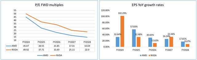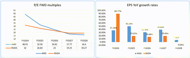 根据2024年市盈率隐含比率,AMD的交易价格比其竞争对手高出53%,而现在的交易价格却便宜了9.7%。这表明过去存在的估值差距已经缩小,而英伟达在最近的惊人反弹后理所当然地占据了领先地位。但这是否意味着AMD真的变得更便宜了?如果我们看绝对值,那么也许是的,但只有在4到5年后,当它的比率降至20倍以下时才会如此。在此之前,我不敢冒险说AMD可以被视为一家便宜的公司。此外,在上图的右侧,我们看到其竞争对手2024年的预计每股收益增长率已从90%(3月份预测)增加到目前的102%以上。与此同时,AMD 2024年的预测每股收益增长率已从3月份预期的37.28%降至32.64%。2024年之后,几乎每年都会出现这种预测EPS水平的下降(2028年除外)。结论很明显:AMD变得更便宜了,但估值的下降是由于未来几年增长率的预计下降。