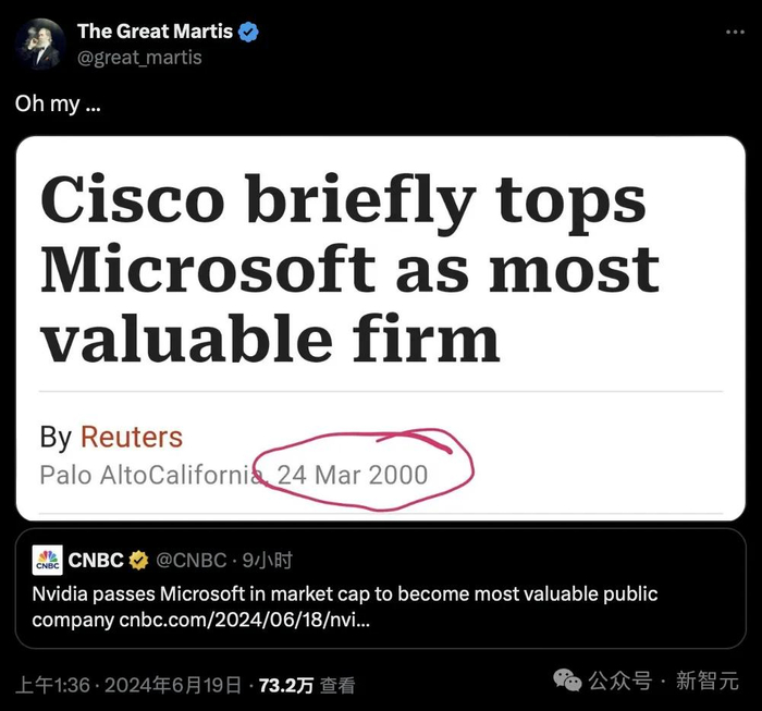 当时华尔街曾做出预言:「英伟达也将超越微软,这大概率已成定局」。短短13天后,这个预言就成真了!