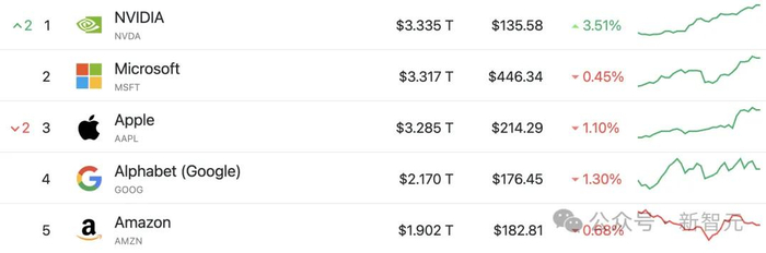 此前,微软市值为3.32万亿美元,随着英伟达股价上涨3.6%之后,市值瞬间超越微软,成为世界第一。